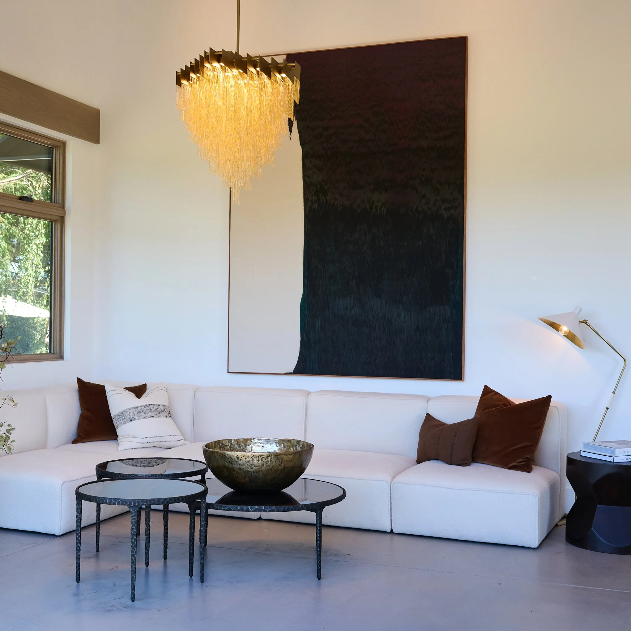 We focused on works with organic forms and layered textures that nod to the surrounding terrain. The palette draws directly from a glass of Pinot Noir—their signature varietal—with notes of burgundy, blush, and earth woven throughout.
